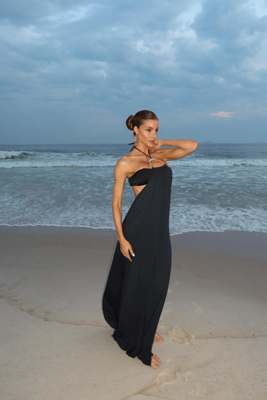 O top é confeccionado em malha trilobal, possui bojo estruturado e fechamento por ganchinho nas costas, garantindo ajuste perfeito e conforto. O vestido midi de modelagem reta em malha preta traz um detalhe metálico dourado estilo gargantilha no colo, valorizando a peça e adicionando sofisticação ao visual. Costurado para sobrepor o top, o vestido conta ainda com amarração no pescoço, garantindo um toque moderno e exclusivo.